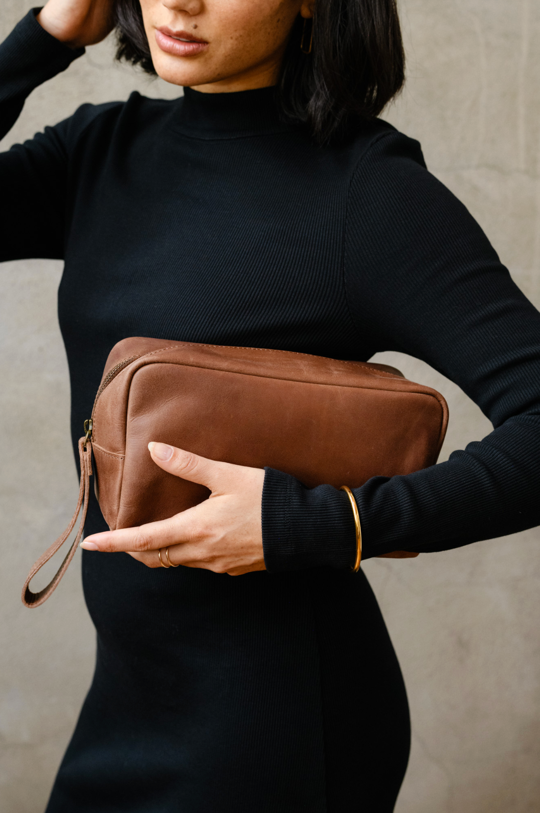 Made of our signature full grain pull up leather, this travel case is designed with a hang strap to make it easy for you to carry your essentials while you travel. Keep your cards secure with the two credit card slots and organize your lipstick, keys, and phone with the two interior pockets.