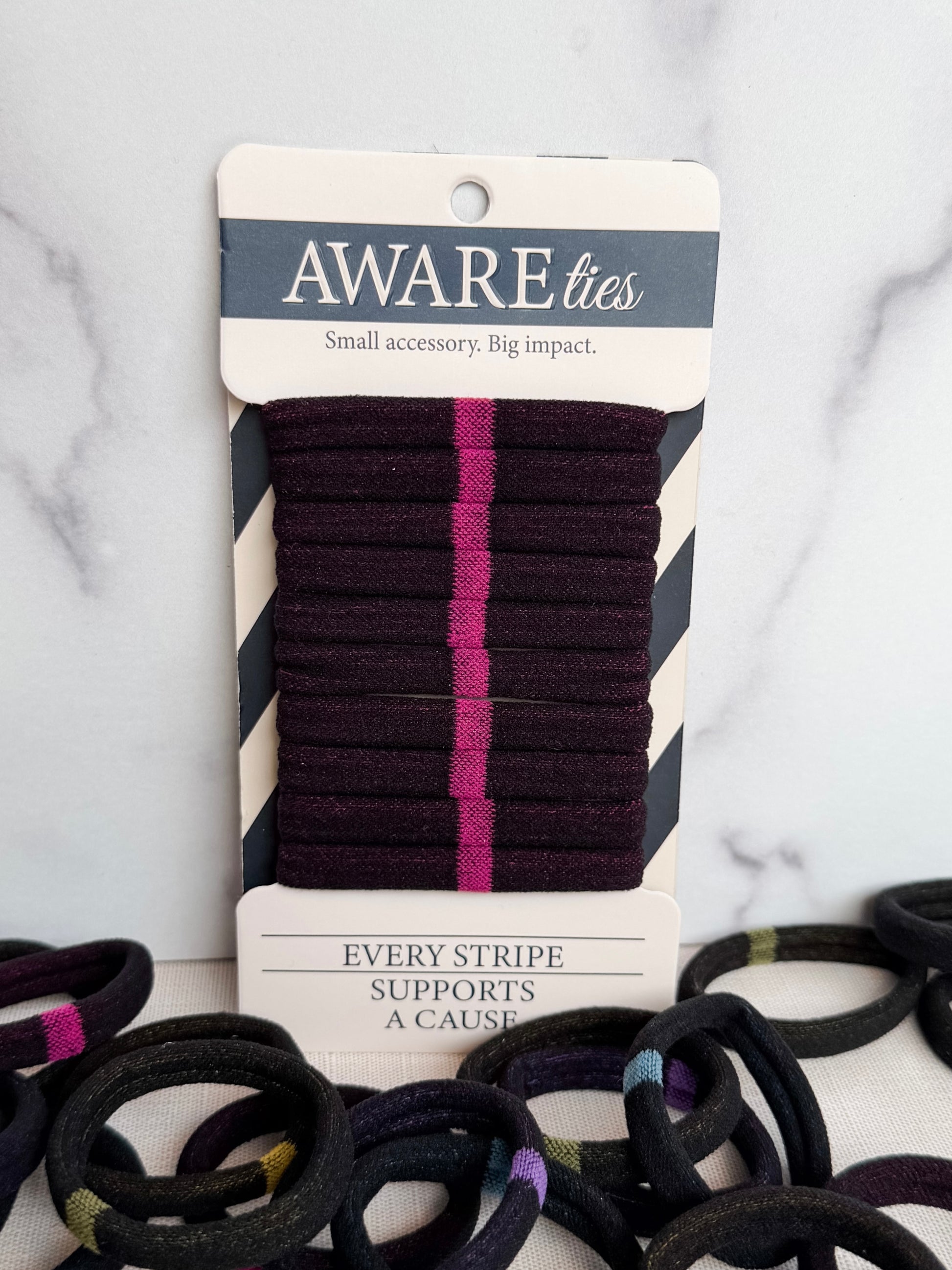Show your support and spread awareness with the Pink Stripe AWAREties — our signature nylon hair ties designed to give back while holding strong. Each pack includes ten durable, no-snag ties that keep your hair secure all day without pulling, breaking, or stretching out.