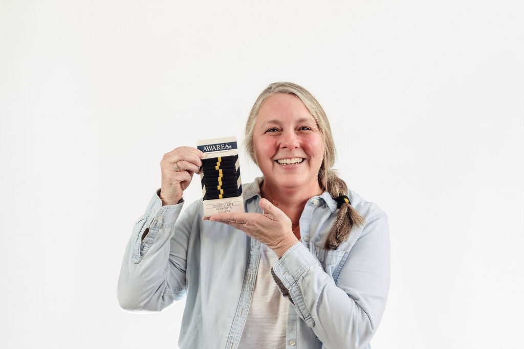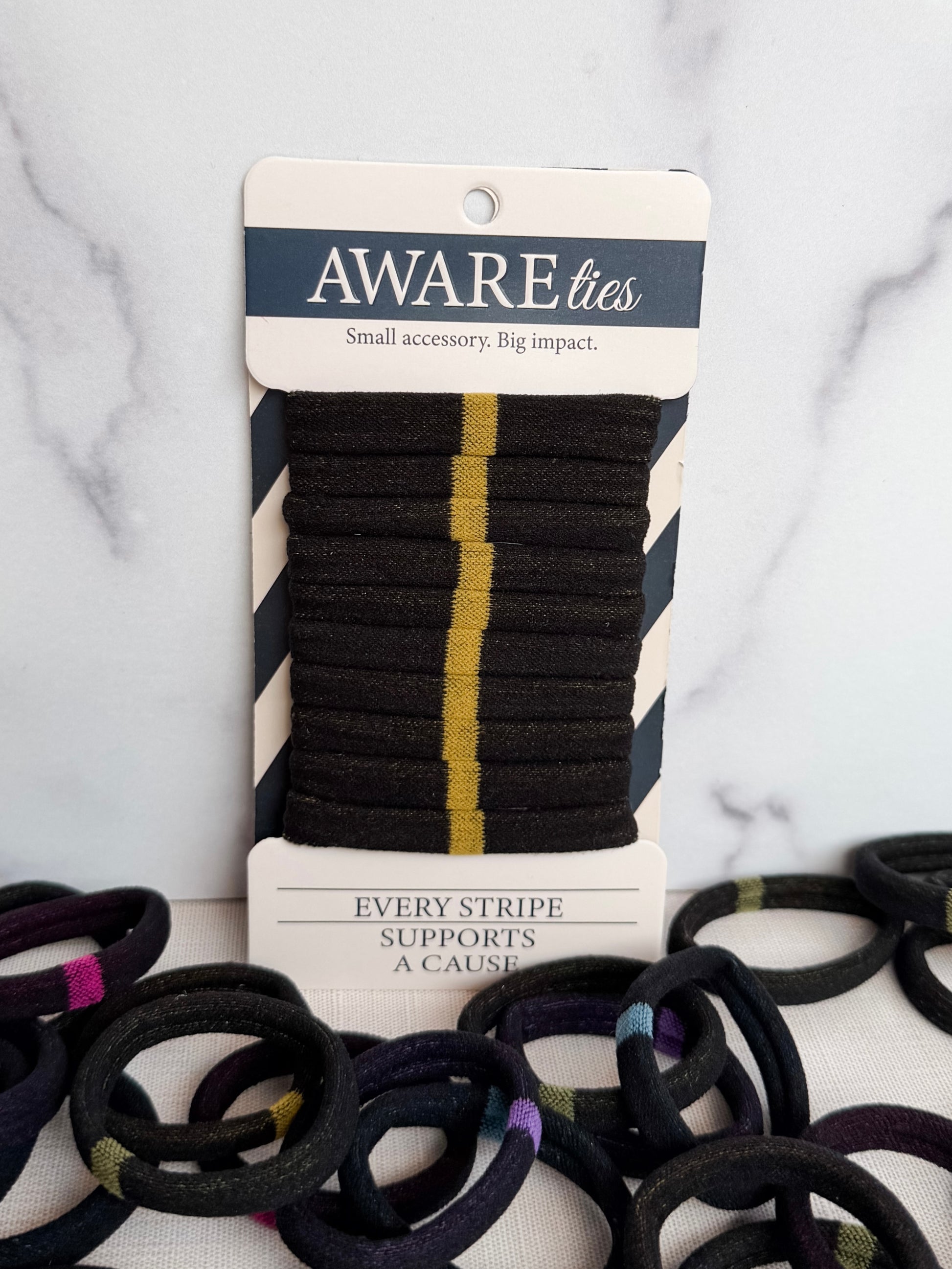 Each pack of ten durable, no-snag nylon hair ties gives 10% back to mental health initiatives and organizations that provide access, education, and support. Whether you wear your yellow stripe as a sign of solidarity, hope, or your own quiet strength, it’s more than a hair tie — it’s a daily reminder that brighter days are always ahead.