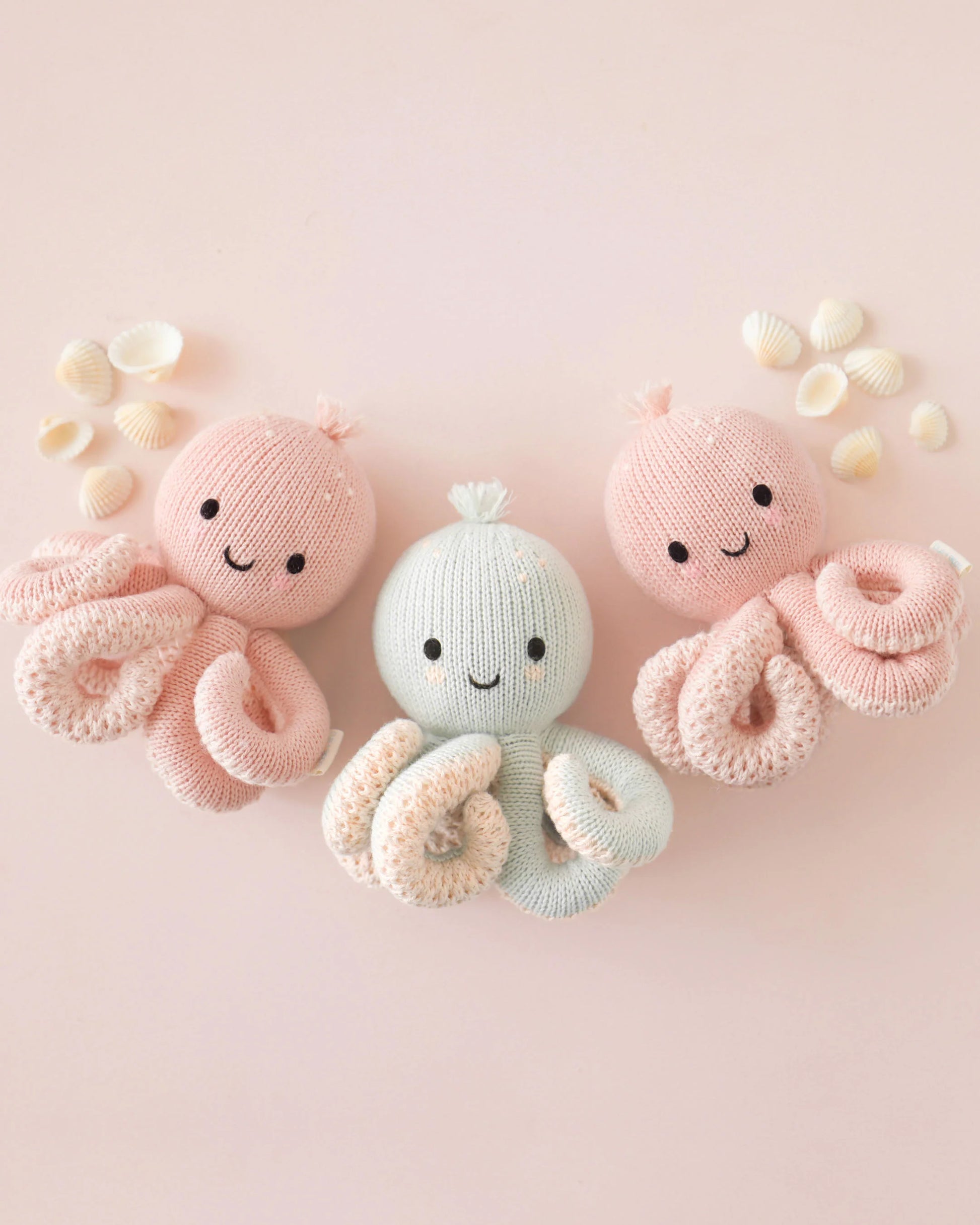 Meet a new kind of cuddle buddy: the Baby Octopus. With its soft coral pink knit and eight gentle arms perfect for little fingers to grasp, this plush feels like a hug in every direction. Hand-knit from premium Peruvian cotton with a snuggly hypoallergenic interior, it’s sweet enough for nurseries and sturdy enough for everyday play. And best of all — every baby octopus purchased provides five meals to children in need — a joyful friend that does good beyond the playroom.