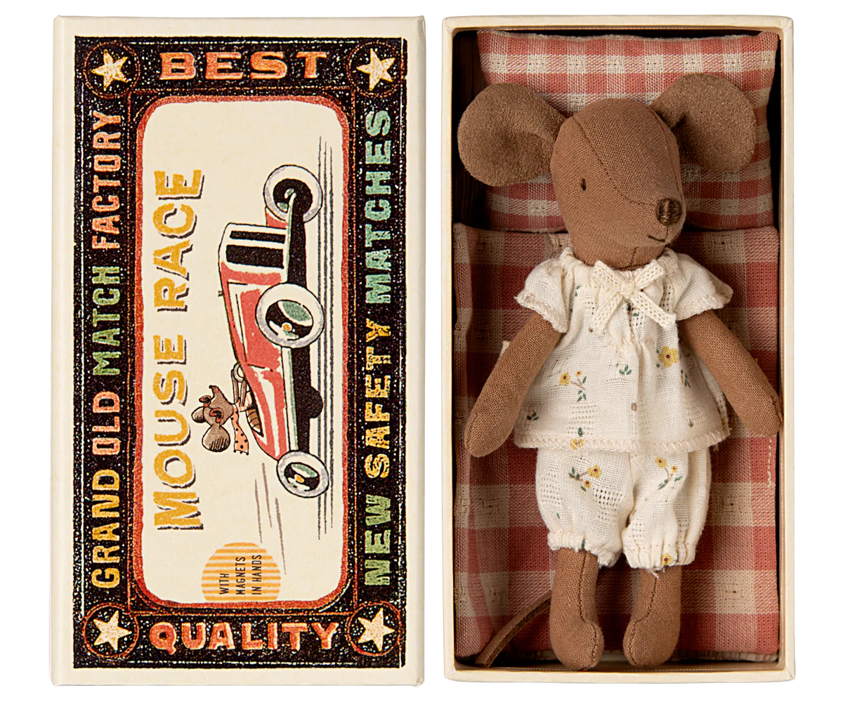 A classic Maileg item. This mouse is ready for hours of play and sleeps tight in a little matchbox. The clothes and bedlinen are made of soft fabrics with unique prints and beautiful colors.