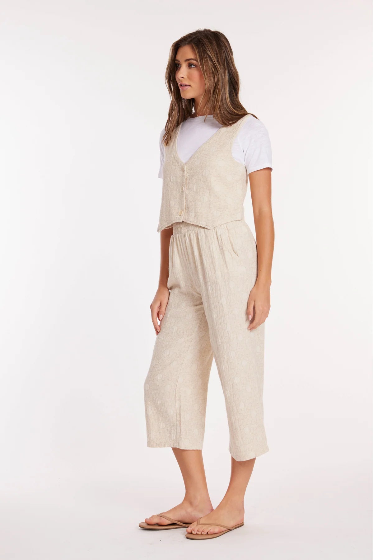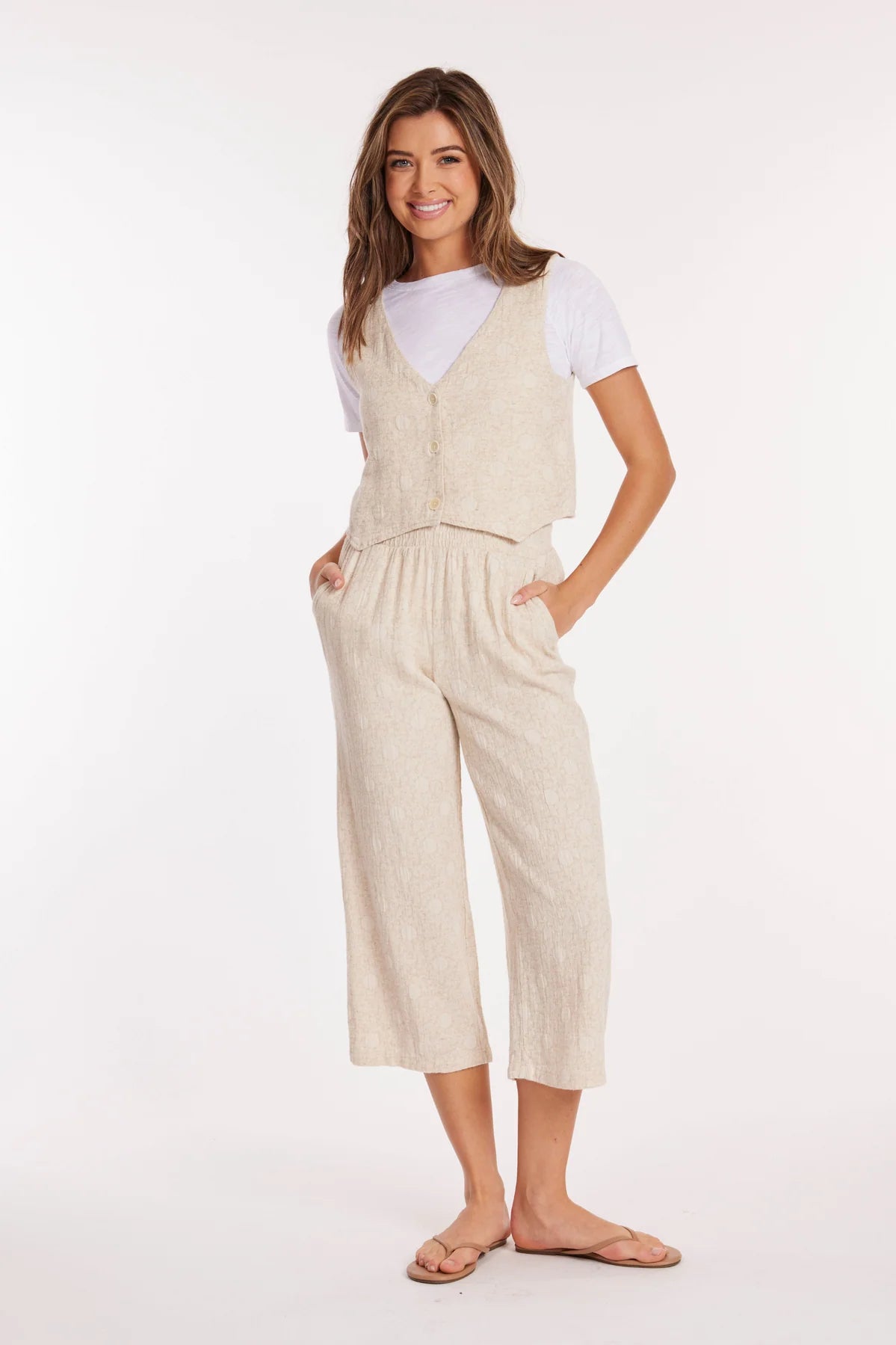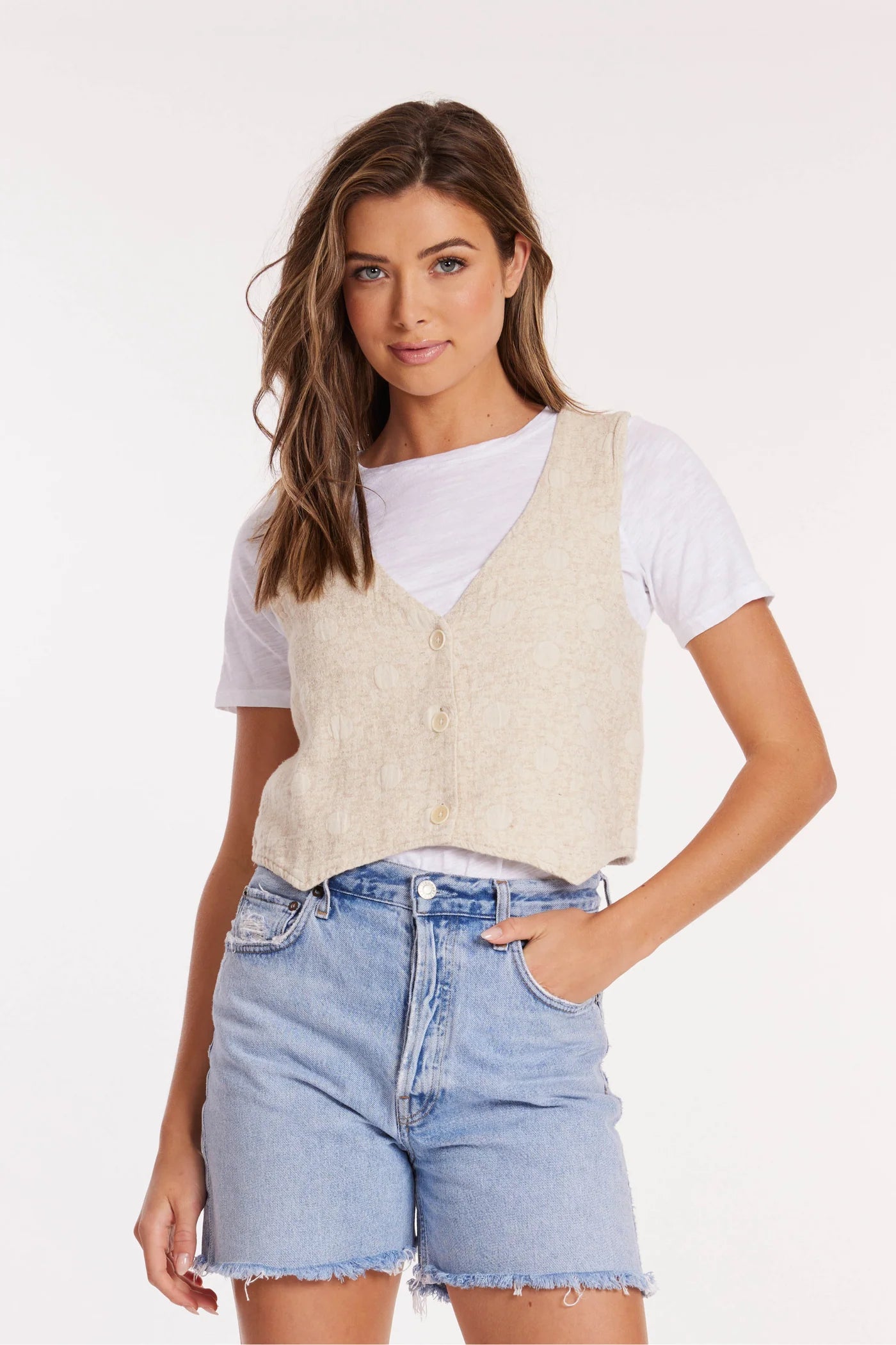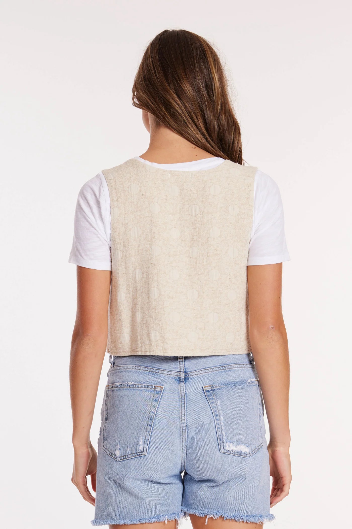 Cropped, classic, and just the right amount of playful—this Button-Front Vest is made from a breezy cotton-linen blend that’s as lightweight as it is charming. Featuring a subtle jacquard dot texture, a flattering V-neckline, and a trio of delicate buttons, it layers effortlessly over your favorite tee or tank. Style it with denim shorts for a casual weekend look or pair it with trousers for a more polished vibe.