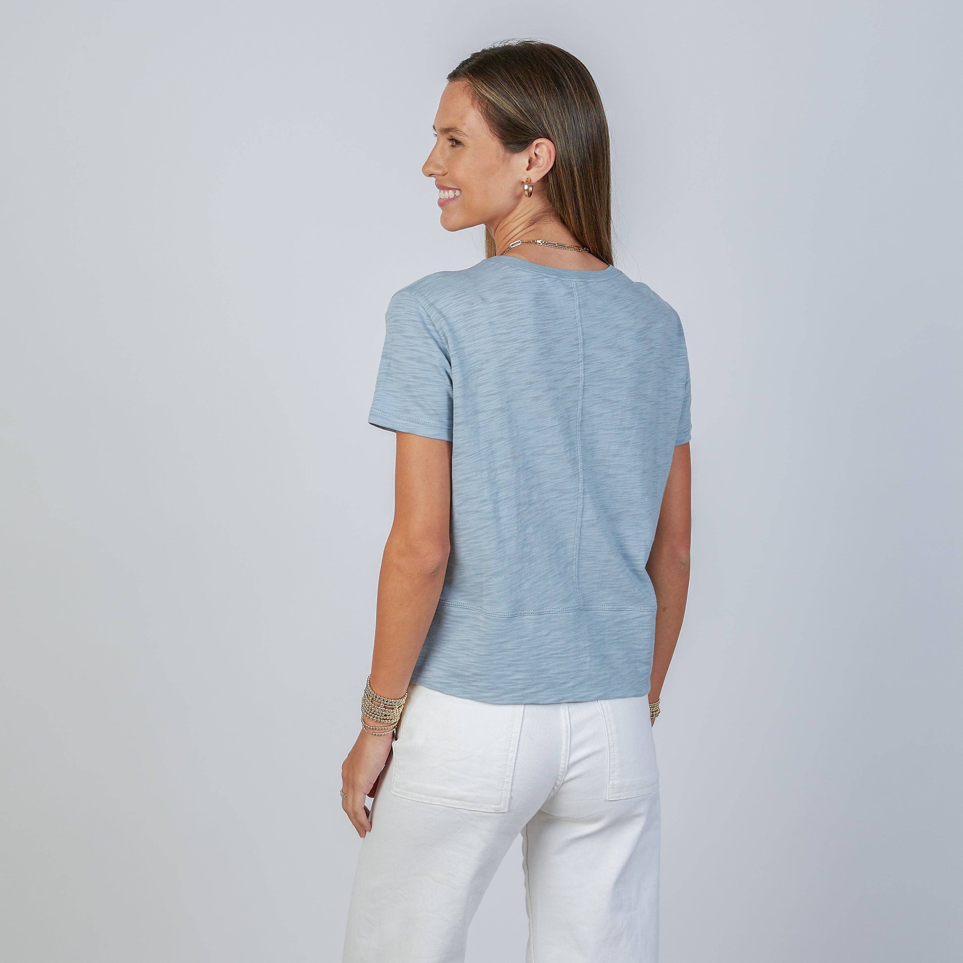 Flattering, effortless, and endlessly wearable. The Celia tee is designed to hit just below the waistband, giving you shape without feeling cropped. A best-seller for a reason, it pairs beautifully with high-rise denim and shorts.