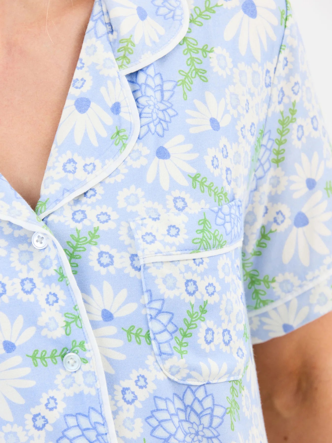 - Playful blue floral print that feels joyful and fresh