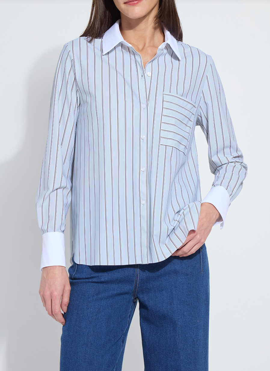 The modern Executive Stripe and White Collar top – made from wrinkle-resistant, 4-way stretch Microfiber – features a crisp collar and cuffs, front patch pocket, button front and raw edge, high-low hem. A front patch pocket with horizontal stripes plays on the shirt’s overall vertical striping. The Executive Stripe & White Collar shirt offers an easy fit and partners well with the Simone Hi Waist Studded Wide Leg and boots.