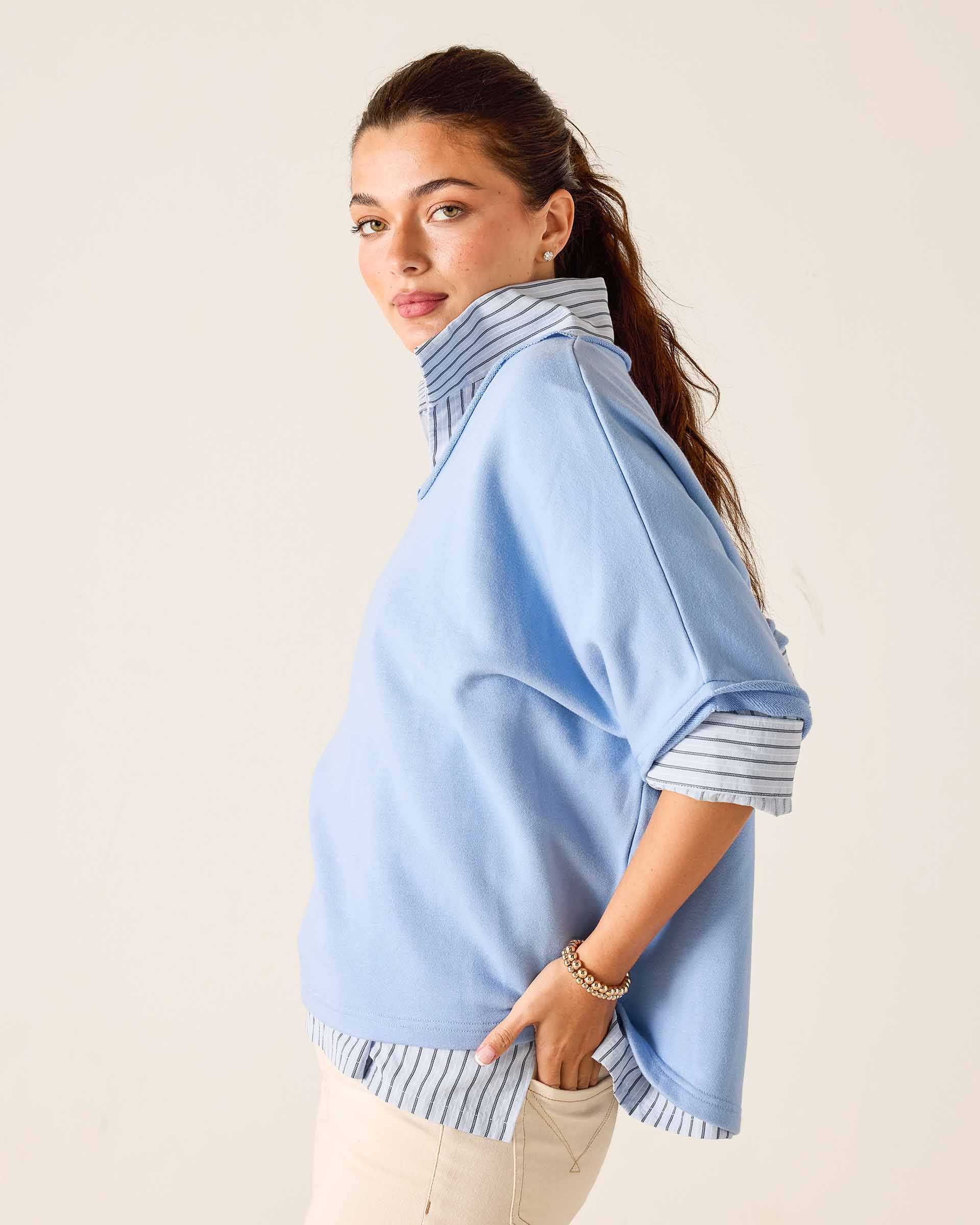 Frenchie Raw Edge V-Neck Sweatshirt in Periwinkle Blue