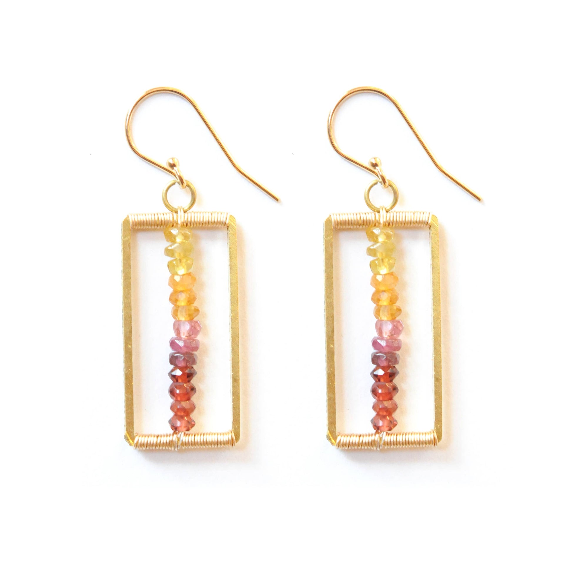 Modern and vibrant, our Gradient Rectangle Earrings in Brass/Golden showcase the beauty of natural color. A sleek rectangular brass frame highlights a vertical line of semi-precious stones arranged in a stunning gradient, moving from light to rich tones. Lightweight and unique, these earrings are a perfect way to add color and artistry to your everyday style.