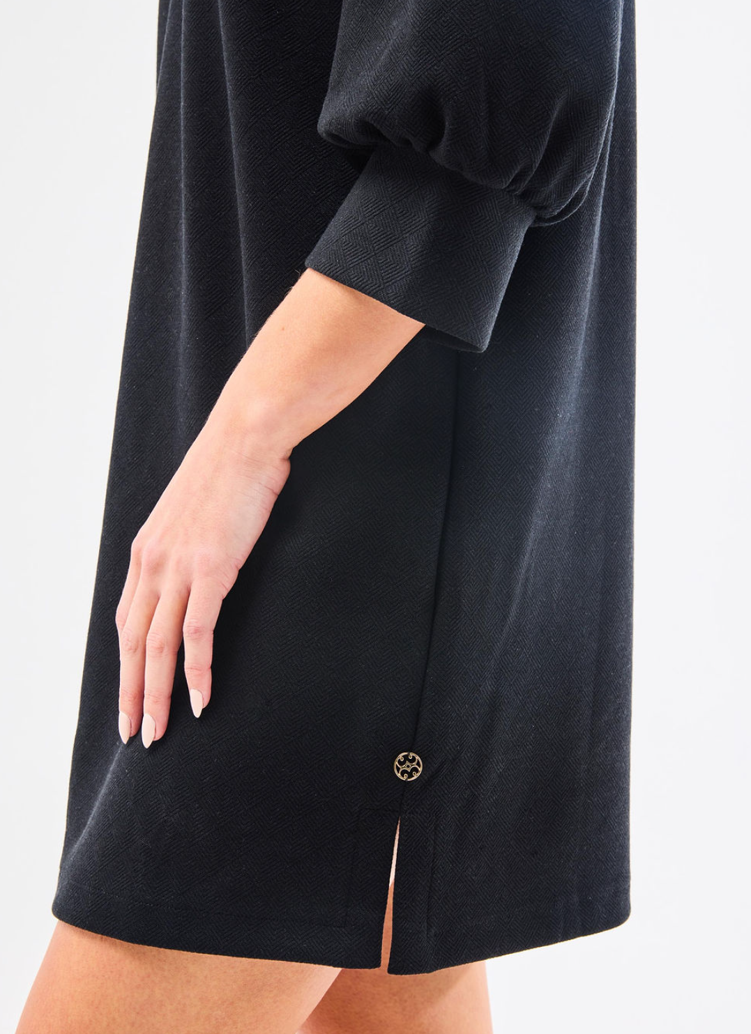 The Hadley Dress by Mary Square is a versatile wardrobe staple designed for effortless style. Made from a soft, subtly textured fabric with a touch of stretch, this black 3/4 sleeve dress features a modern pop collar, a flattering V-neckline, and side hem slits for added comfort and movement. The notched cuffs offer easy styling options—wear them folded or extended for a polished finish.