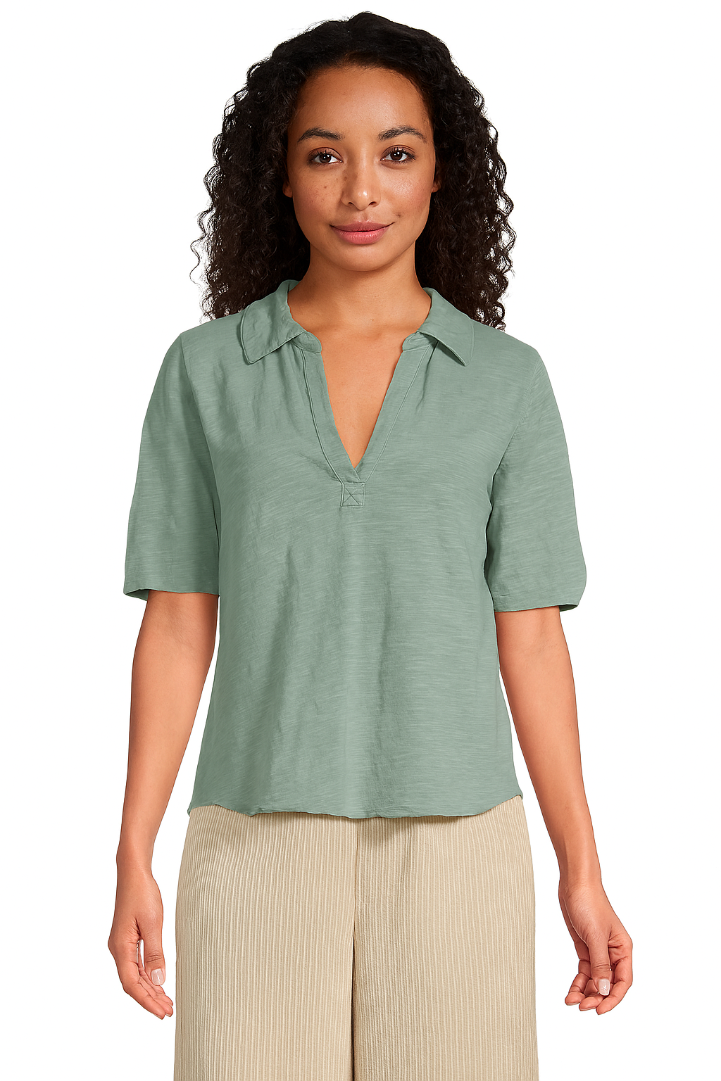 Effortless and elevated—that’s the vibe of this soft cotton polo. With a relaxed collar and gently draped half sleeves, this tee is the kind of staple that makes everyday style feel special. The lightweight slub texture adds a hint of movement (and just enough polish), while the open neckline keeps it casual and cool.
