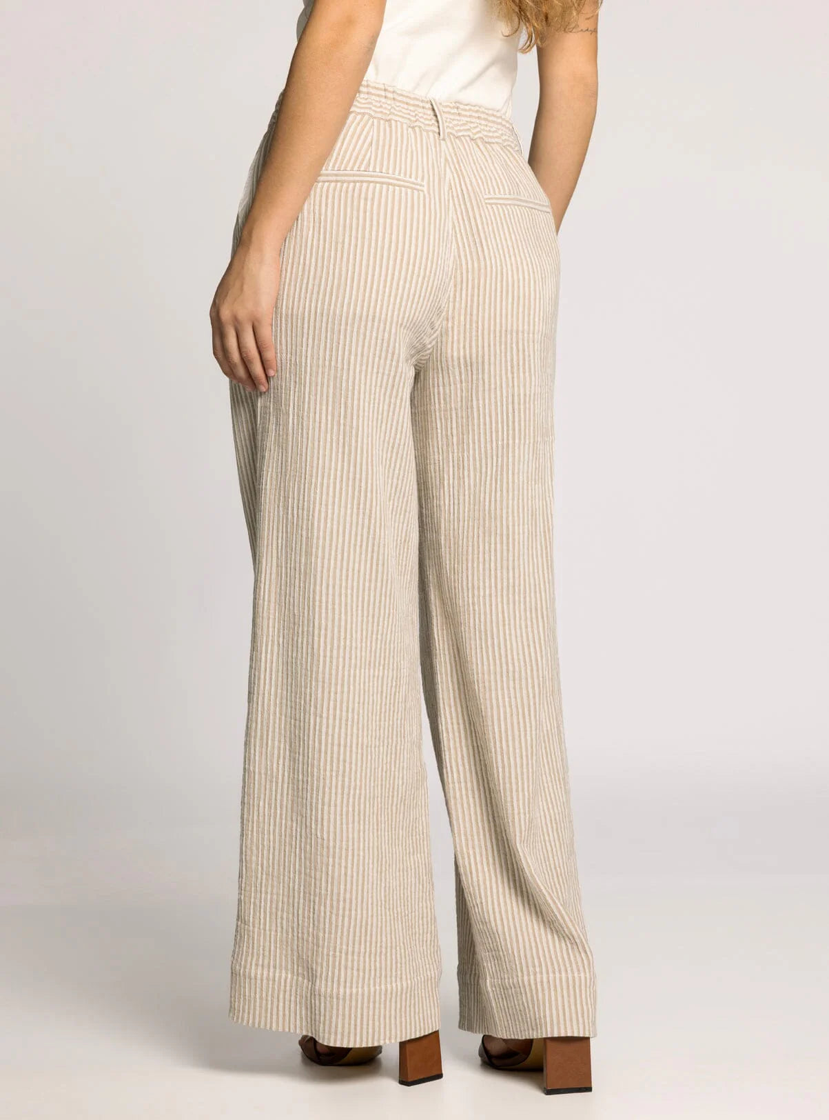 These are the pants you grab when you want to look put-together without overthinking it. The subtle stripe adds interest without screaming for attention, and the wide leg silhouette gives that effortless, lengthened look we all love. Made from 100% cotton, they’re breathable, wearable, and built for real days that include sitting, standing, errands, meetings, and everything in between.