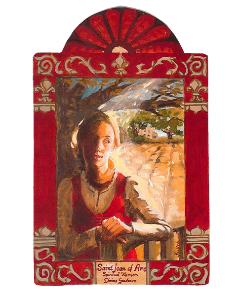 Joan of Arc (Jeanne d'Arc) was born in 1412 in the remote town of Domrémy in France. Joan witnessed her peasant village burn before the age of 12 by the French Burgundians. The Burgundians sided with the King of England, trying to help him win the French throne toward the end of the Hundred Year War. At the age of 12 the Archangel Michael, St. Catherine and St. Margaret spoke to Joan in the field by her house. She was greatly joyed by their presence and cried when they left because they were "so beautiful". At age 17, they told her to go to Charles of France to ask for an army to defeat the English. The young, uncrowned king gave her a small army which she led to victory in d' Orleans in 1429, changing the course of the Hundred Year War. Joan was an innocent caught in the politics. She was eventually captured by the Burgundians, sold to the British and tried in a biased court that found her to be a heretic and burned her at the stake.