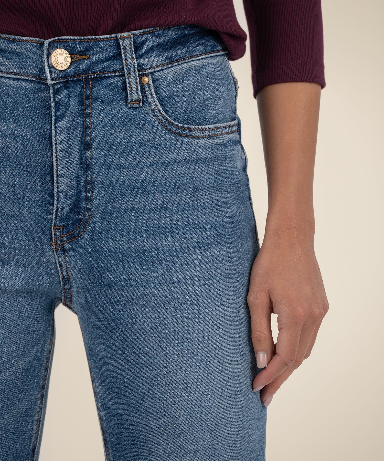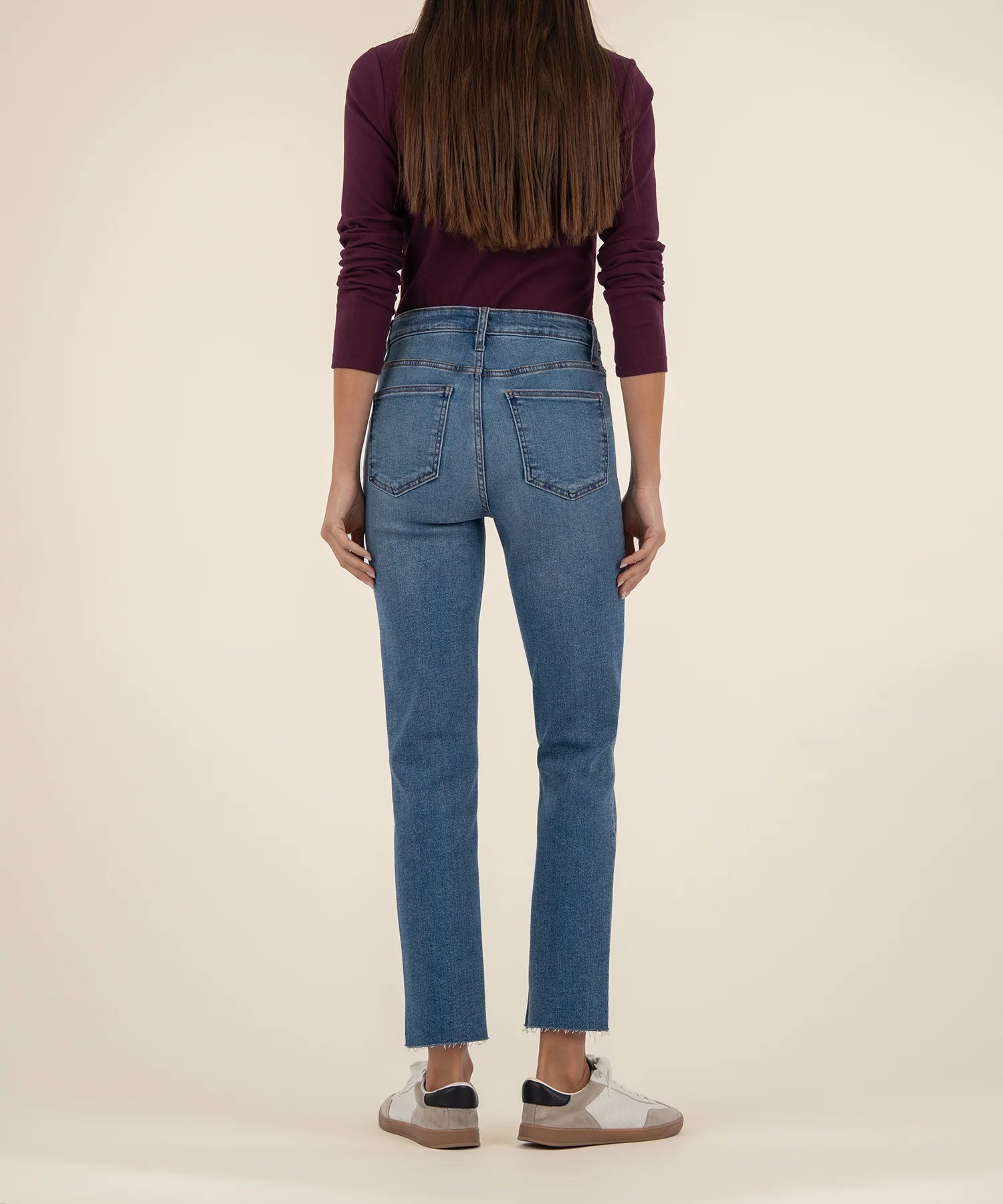These high-rise mom jeans offer a clean, modern take on a classic silhouette. Designed in a medium wash with Fab Ab pockets for a flattering fit, they feature a raw hem and are made from stretchy material for all-day comfort and style.