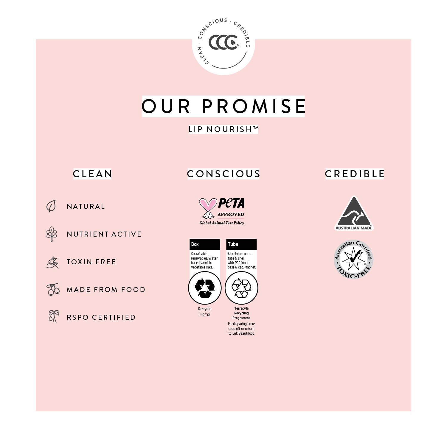• Lip Nourish™ in Pink Juniper — light dusky pink with sheer coverage and a satin finish. Infused with orange and juniper berry for a subtle, fresh flavor.