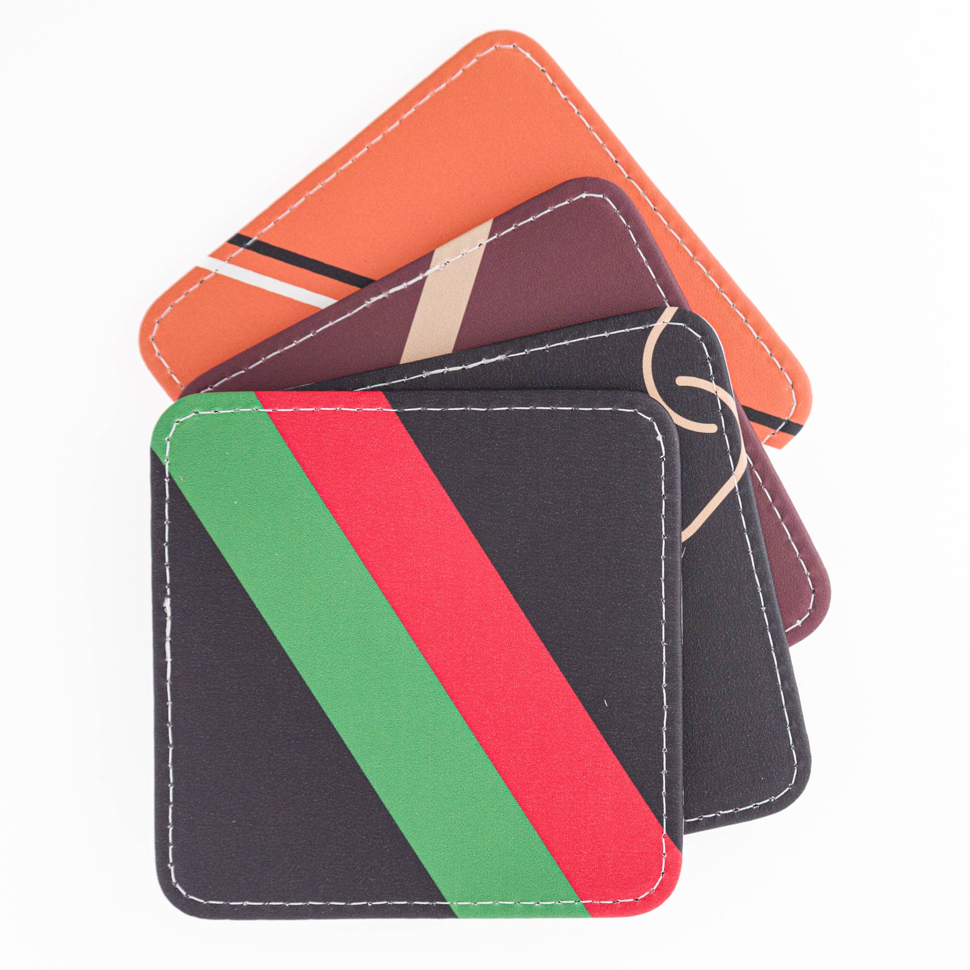 - Includes: set of 4 coasters (reversible designs)