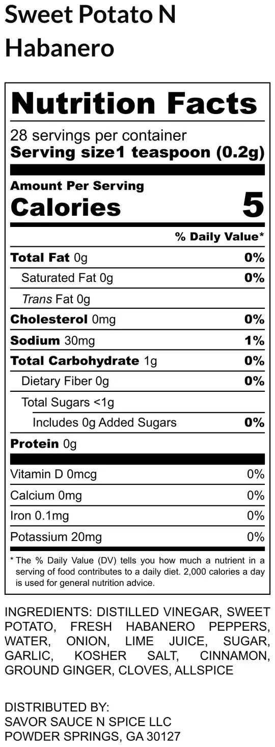 Get a fiery kick of habaneros with this uniquely sweet potato flavored sauce. Pairs perfectly with chicken, shrimp and fish.
